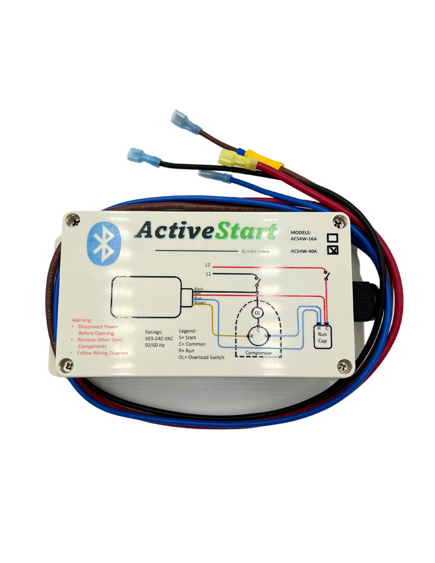 The ActiveStart ACS4W40 softstart product gets wired directly to the compressor of an air conditioning system. It is dual voltage rated working for either 115 Vac or 230 Vac systems and comes with 4 wires so making the connections are very easy with this unit. The 40 amp version is ideal for Residential Home systems, drawing less than 40 amps this is typically 6 tons or less. It has Bluetooth available with a user app to monitor the operation of the unit with fault alarms.